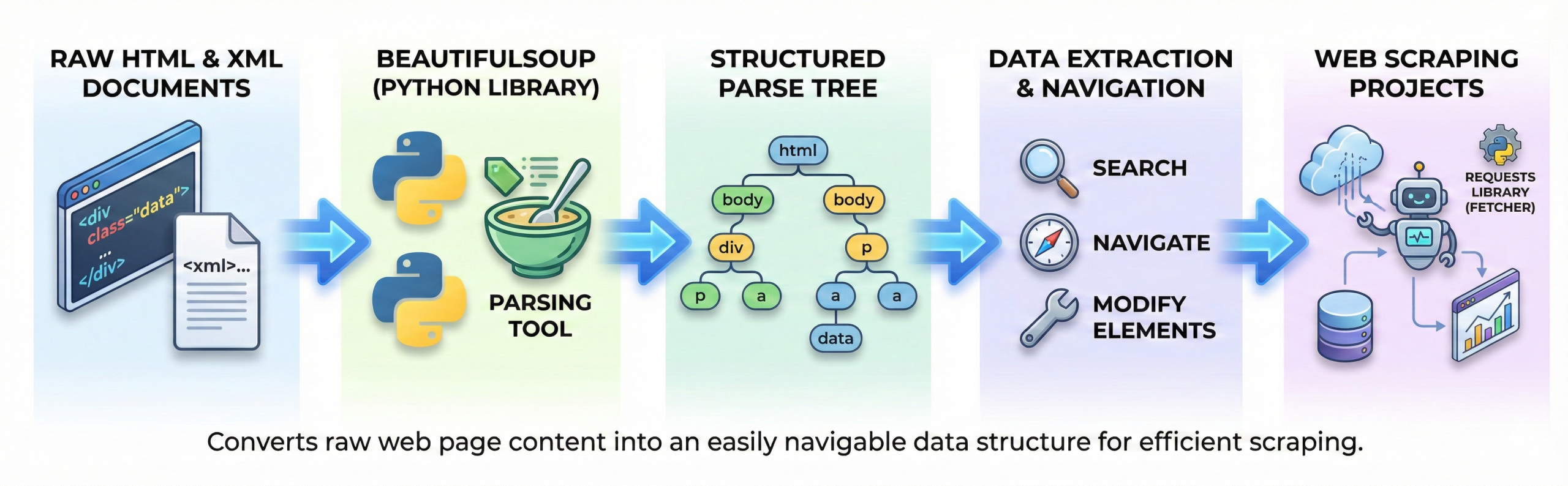 When you pass raw HTML to BeautifulSoup, the parser processes that text and builds a tree-like structure (similar to the DOM in web browsers). This structure allows you to easily search, navigate, and extract data from the document.