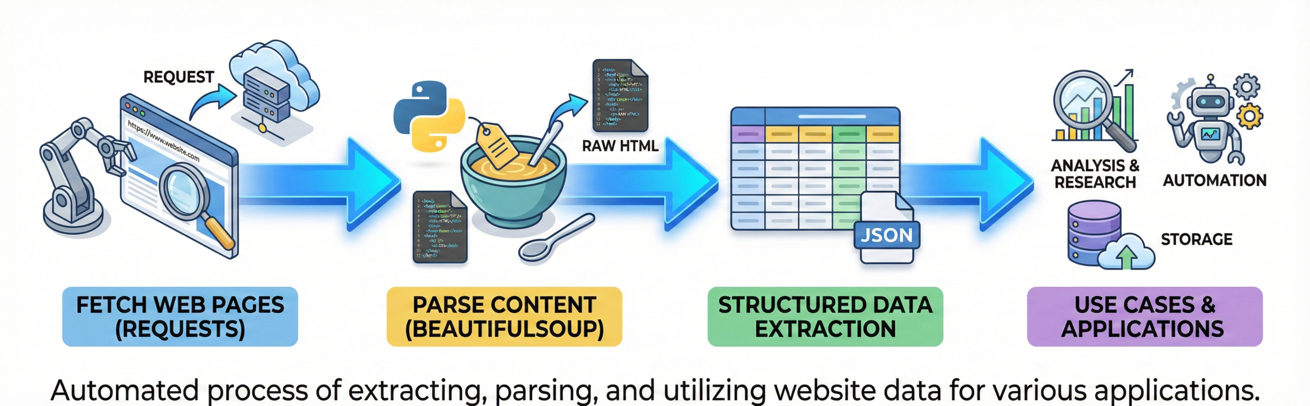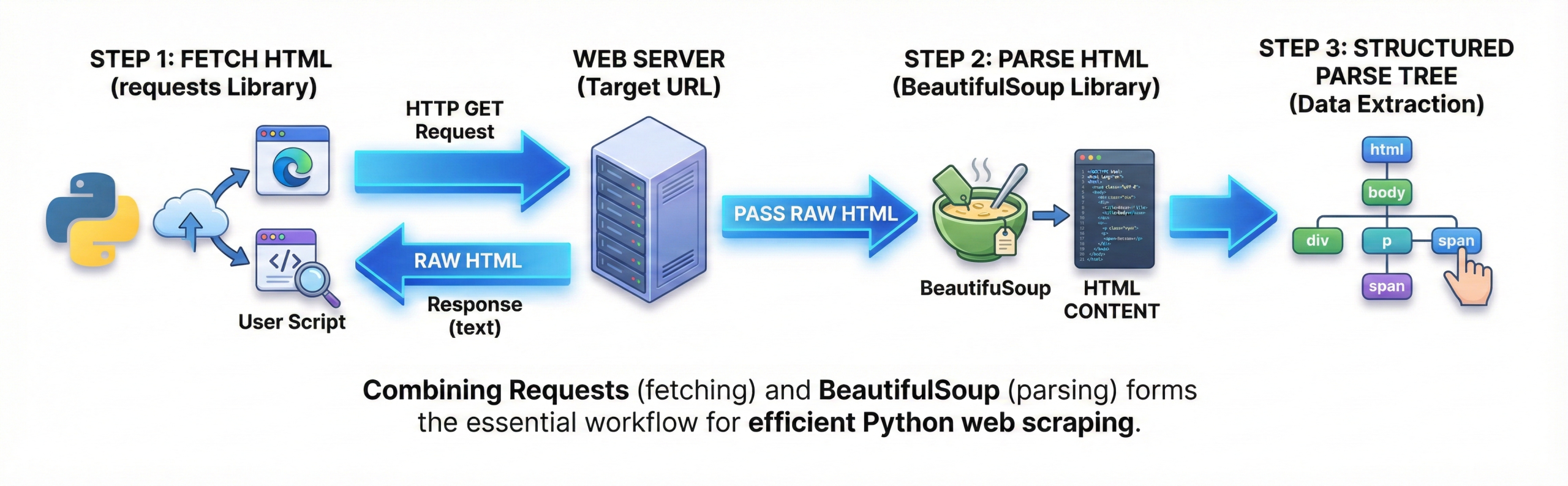 Requests handles HTTP communication; BeautifulSoup handles parsing. Together they form the backbone of Python web scraping.