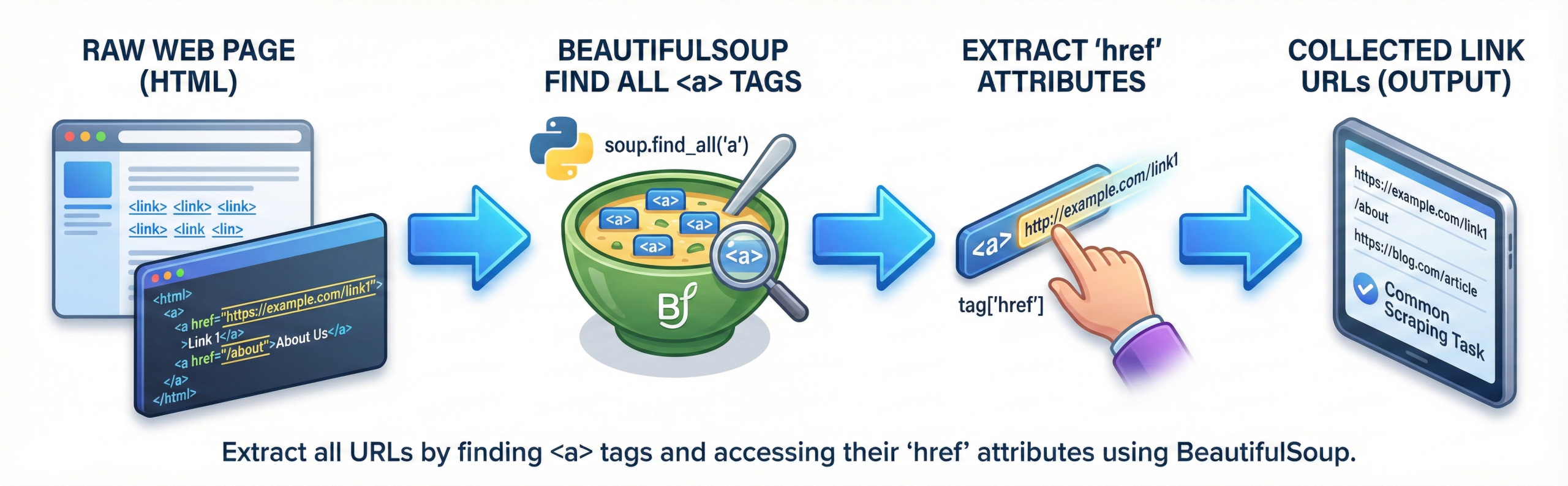 Links are extracted by finding all <a> tags. The href attribute contains the URL.