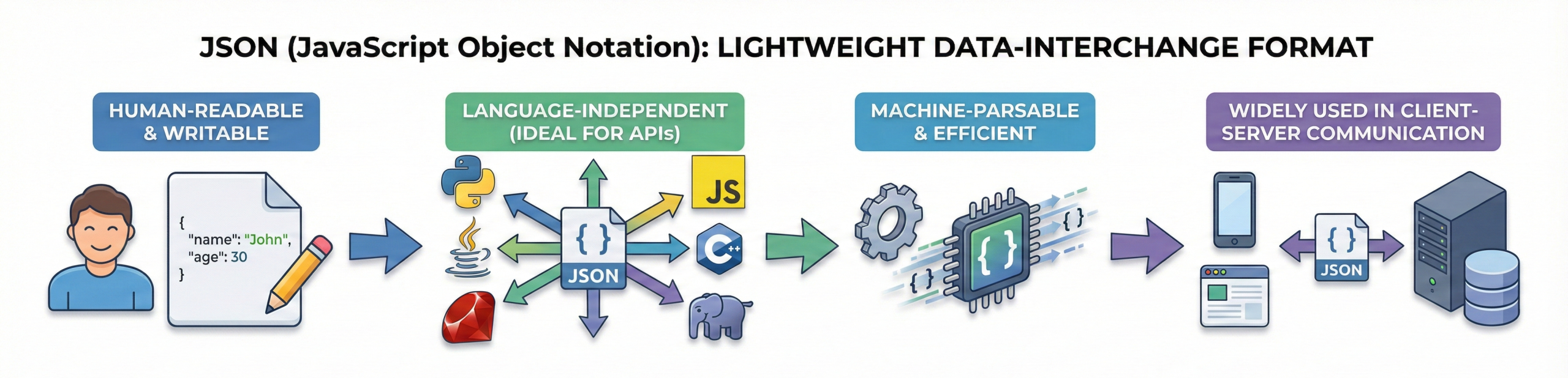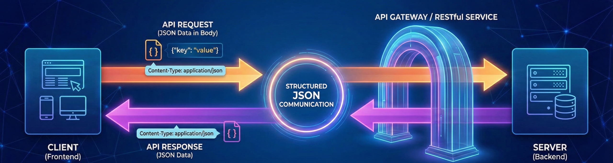 JSON enables structured communication between frontend and backend systems. This request-response flow forms the backbone of RESTful services.