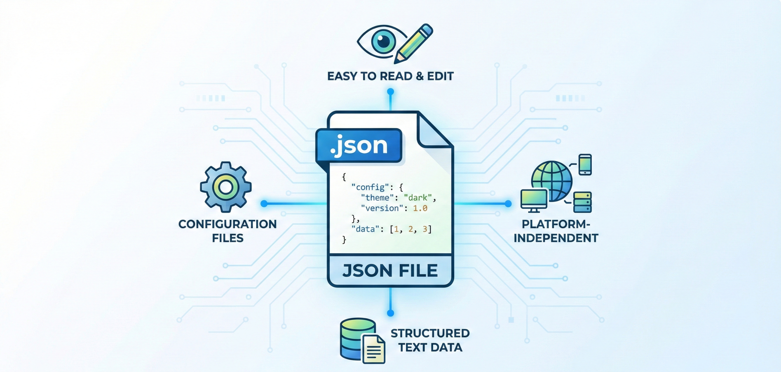 They are commonly used for configuration files. JSON files are platform-independent. They are easy to read and edit.